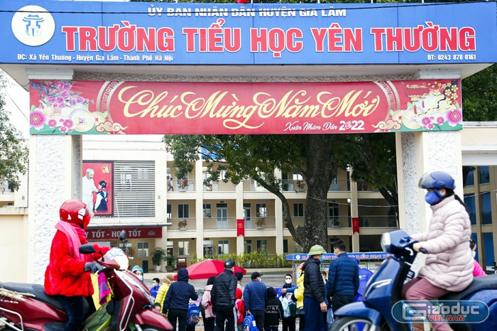 Sáng 10/2, học sinh cấp tiểu học, lớp 6 thuộc 18 huyện, thị xã ngoại thành trở lại trường học trực tiếp. 6h30, cổng trường Tiểu học Yên Thường (huyện Gia Lâm, Hà Nội) trở nên nhộn nhịp, đa số học sinh được bố mẹ đưa tới trường.